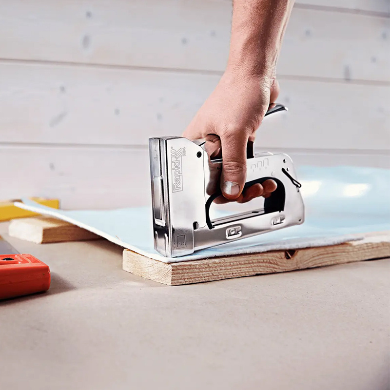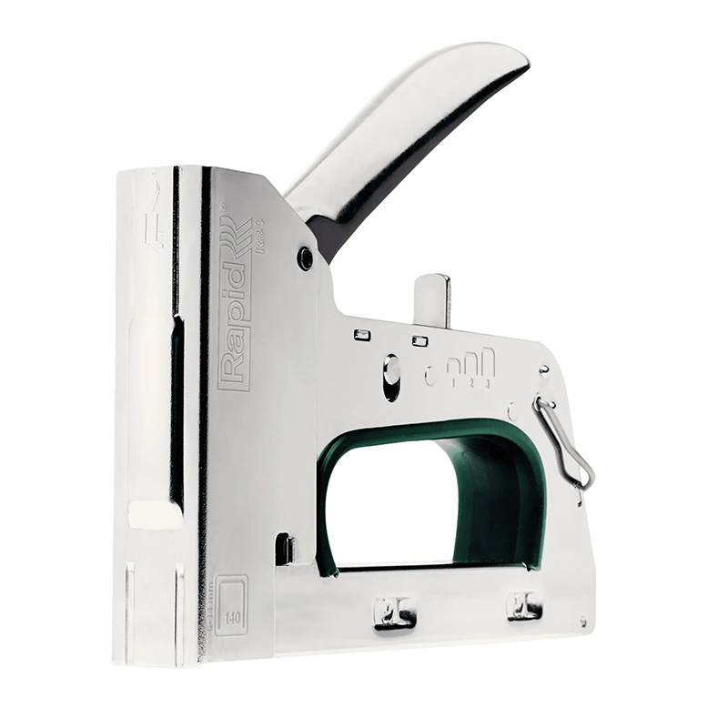 Agrafeuse manuelle RAPID R34 Ultra-résistante, idéale pour isolants, moquettes, bâches. Réglage de puissance breveté pour 40 % d’effort en moins. Compatible agrafes 140 (6-14 mm).