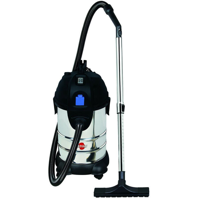 Aspirateur eau/poussières LEM 1400X cuve inox 30L. Idéal atelier, chantier et électroportatif avec prise synchronisée. Décolmatage manuel « Push & Clean » sans arrêt. Cuve inox, filtre classe L, 1400 W.