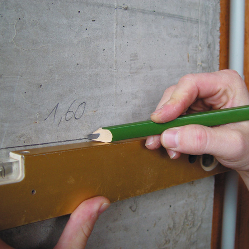 Crayons en bois de tilleul avec mine dure 10H, conçus pour marquer durablement sur surfaces rugueuses comme la pierre, la brique et le béton. Résistants aux intempéries, en couleur verte, conditionnés par boîte de 12.