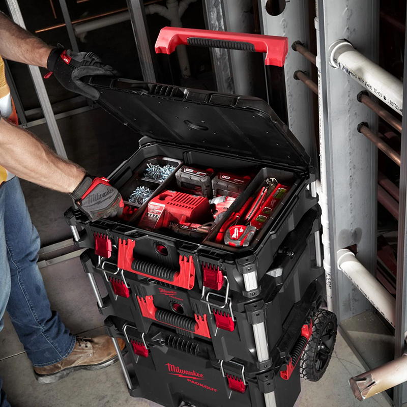 La box standard PACKOUT™ Milwaukee offre une organisation optimale grâce à son système modulaire. Fabriquée en polymère résistant aux chocs et dotée d’un joint étanche IP 65, elle protège vos outils de la poussière et de l'eau. Son plateau organisateur et ses coins renforcés garantissent durabilité et sécurité.