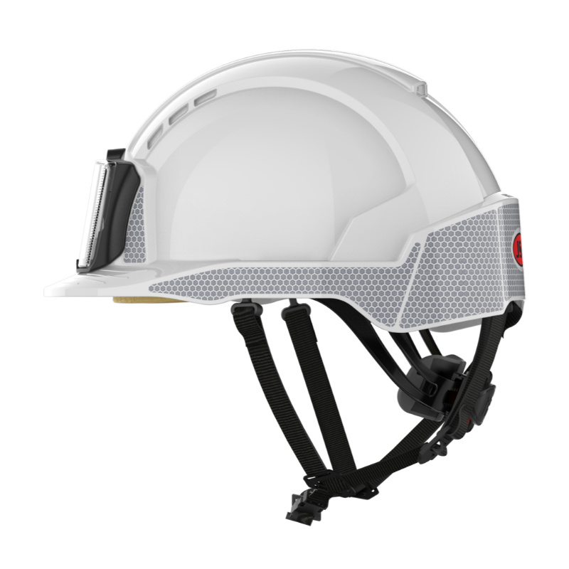 Pour BTP & second œuvre : porte-badge étanche, jugulaire 4 pts, lunettes rétractables. Réglage 3D + crémaillère Revolution™, bandes réfléchissantes. Calotte ABS, ventilation latérale, normes EN 397 / EN 166.