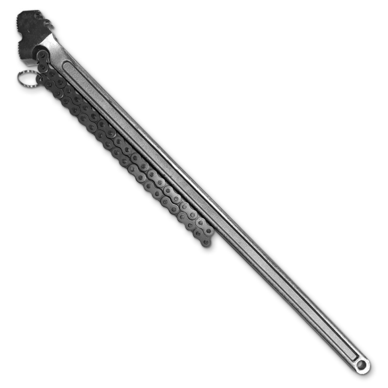 Clé à chaîne CAP 6" avec double denture pour inversion rapide. Manche monobloc acier Chrome Vanadium forgé. Capacité serrage 90 mm, pré-serrage 160 mm. Manche 300 mm.