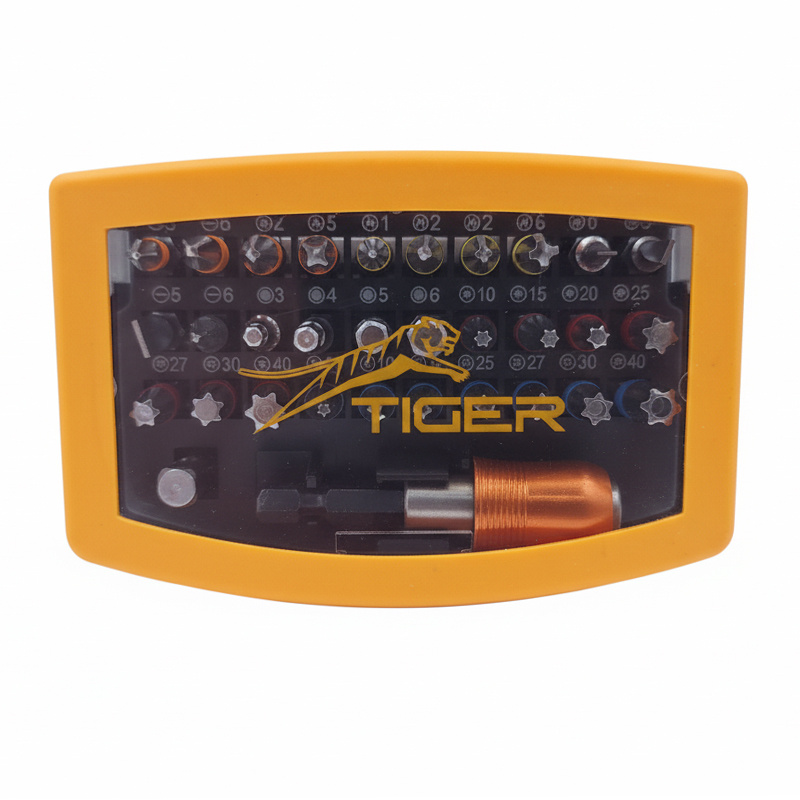 Coffret 32 embouts TIGER avec repérage couleur. Empreintes PH, PZ, fente, hex, Torx, Torx percés. Porte-embouts magnétique + adaptateur inclus. Acier S2.