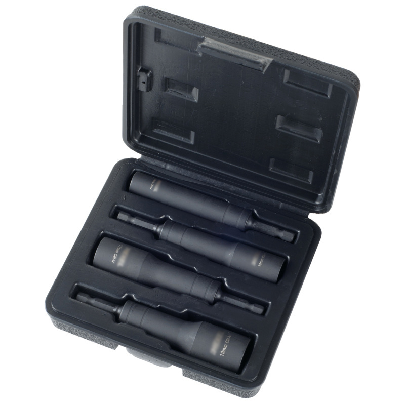 Coffret de 4 douilles articulées Ø10, 13, 17 et 19 mm, avec une inclinaison de 15° pour un accès facilité aux boulons. Longueur de 115 mm, idéal pour un serrage précis et efficace.