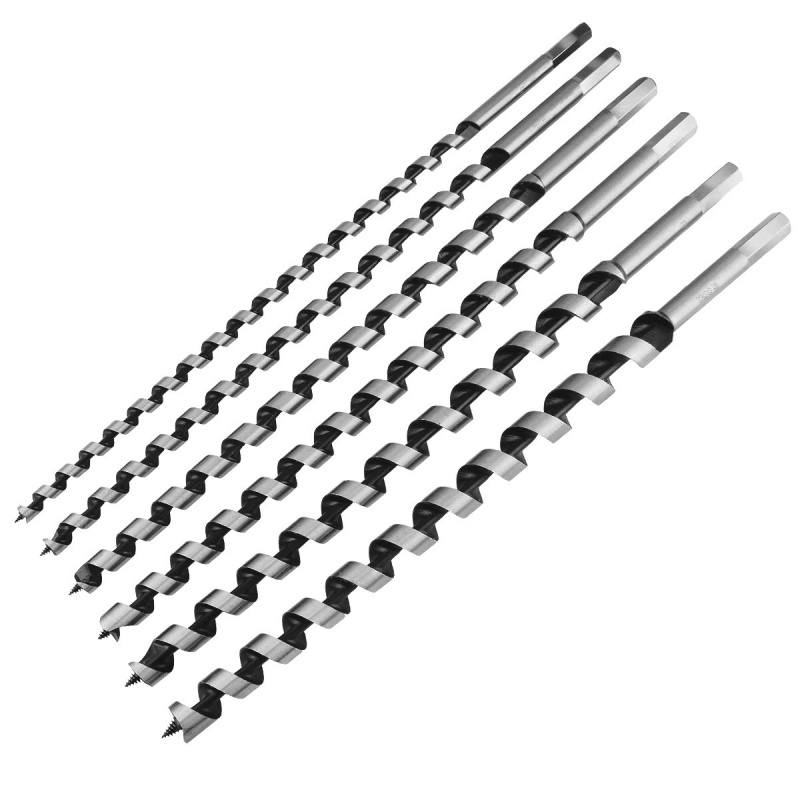 Valise 6 mèches bois Ø 10–20 mm, L 460 mm, emmanchement hexagonal. Pointe autoforeuse, spirales longues. Coffret bois inclus.