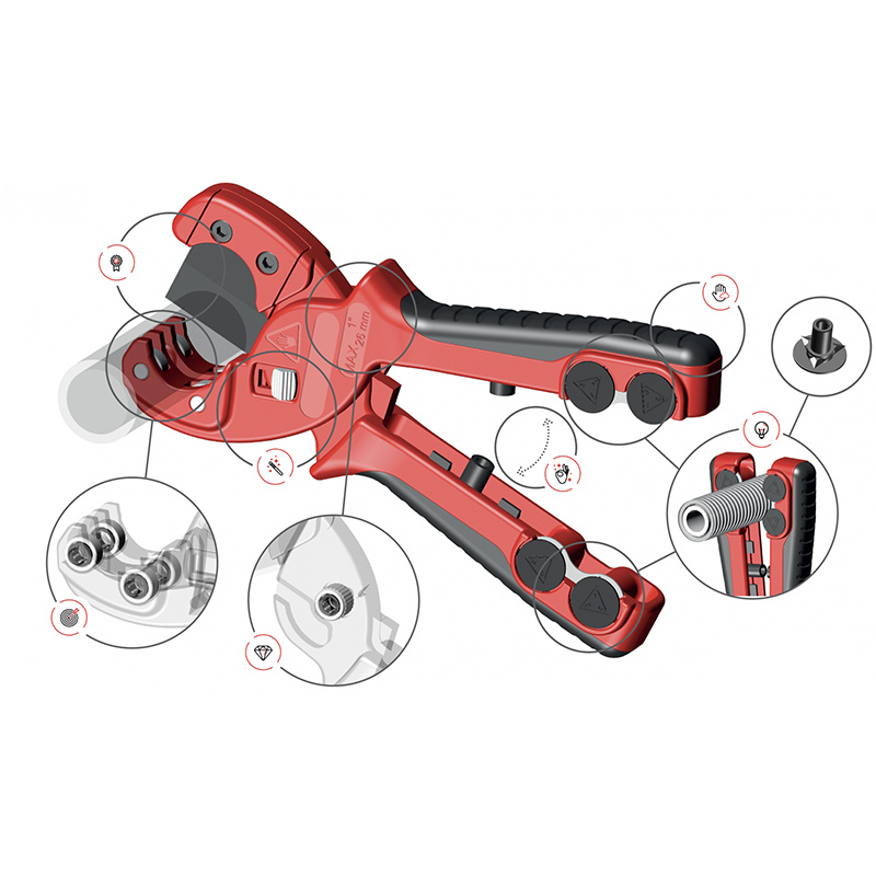 Coupe-tubes Multicouche DUOCUT Ø0‑26 mm. Coupe nette et précise des tubes multicouche. Lame Solingen PTFE, retour automatique et verrouillage à une main. Poignée ergonomique et système Twist&Cut pour rotation facile du tube.