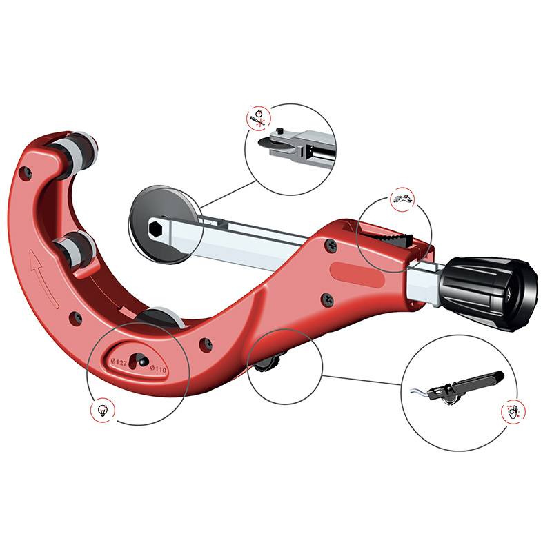 Coupe-tubes plastique Ø50–127 mm Corps aluminium léger. Avance rapide + ébavureur intégré. Molette interchangeable sans outil (ICS). 3 rouleaux de guidage dont 1 réglable (110 / 127 mm).