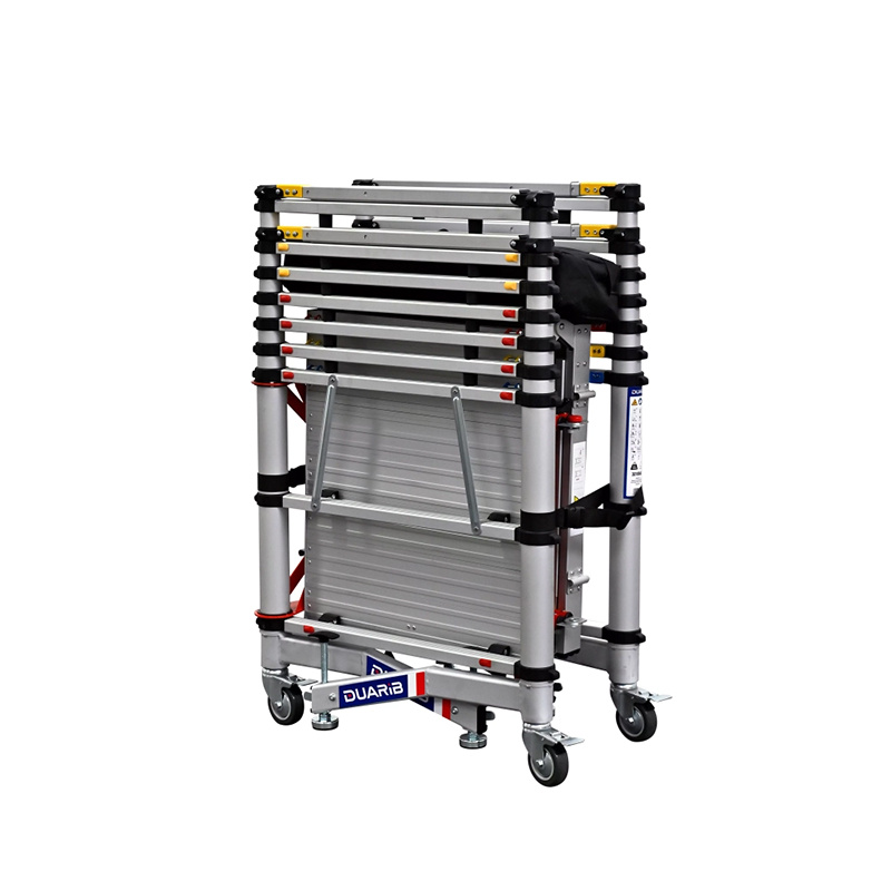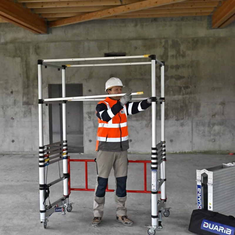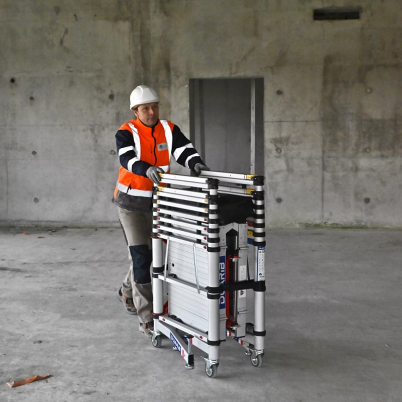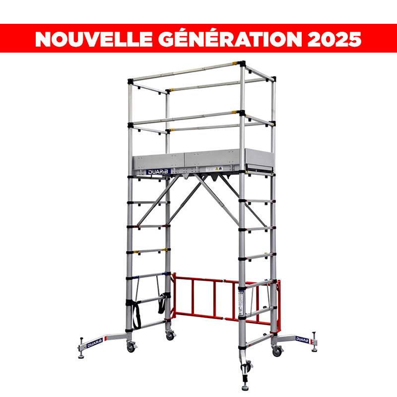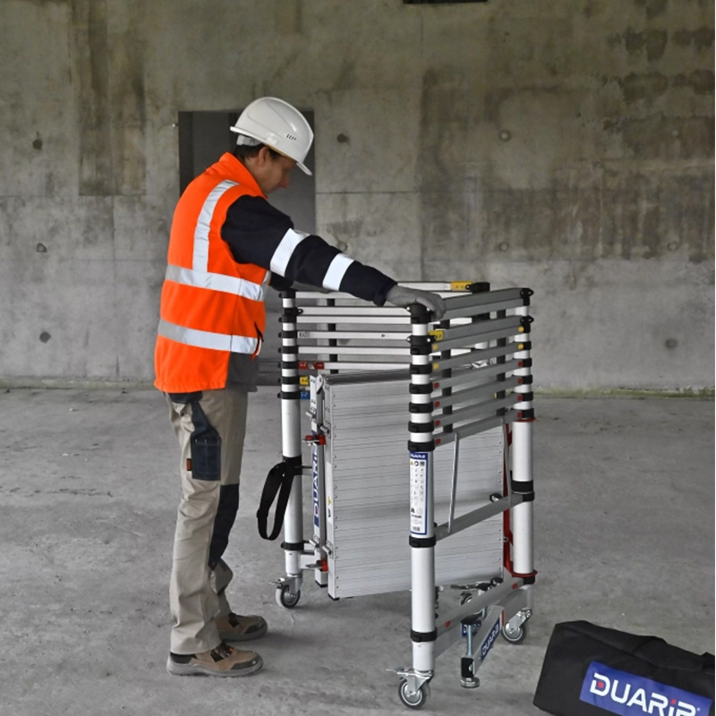 Échafaudage 100% télescopique, réglable tous les 25 cm avec 7 hauteurs de travail. Montage rapide et sécurisé par un seul opérateur. Compact et léger, il se range facilement dans un petit utilitaire. Plancher aluminium avec trappe et plinthes amovibles. 4 stabilisateurs intégrés et roues Ø 100 mm à frein. Charge admissible : 150 kg. Fabrication robuste et conforme aux normes de sécurité (Décret 2004-924).