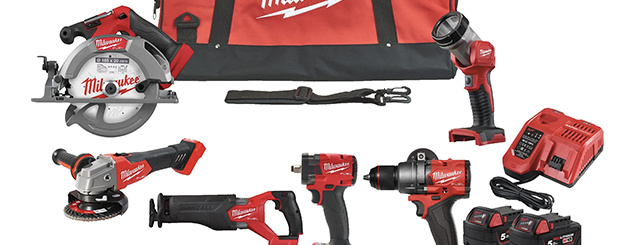 Pack Milwaukee 18V/5Ah – 3 machines. Inclut : visseuse M18 BLPD2, perfo SDS+ M18 BLHX (2,3 J), meuleuse M18 FSAG125X. Avec 3 batteries 5 Ah, 1 chargeur...