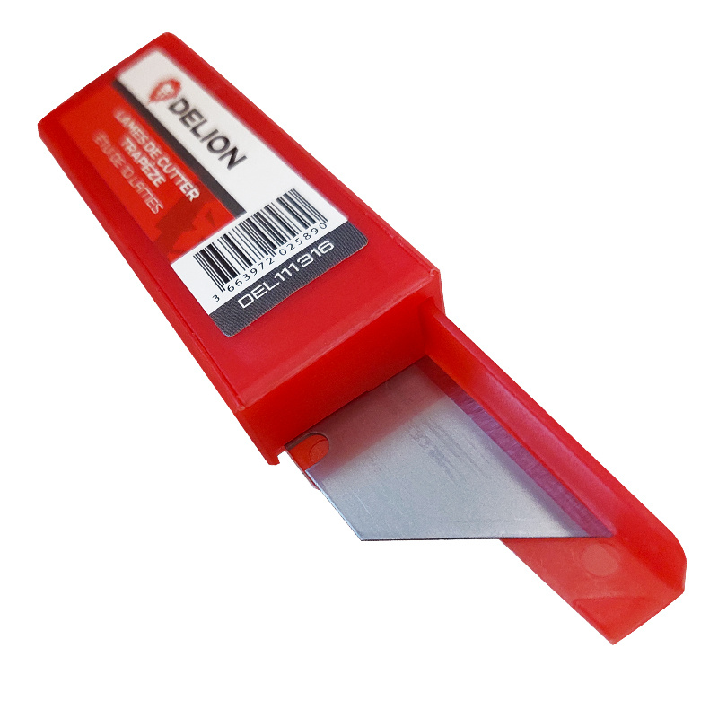 Étui 10 lames cutter trapèze Delion, 0,65 mm d’épaisseur. Idéal pour tapis, linoléum, moquettes. Compatible cutters Stanley et autres. Dimensions : 62 x 19 mm.