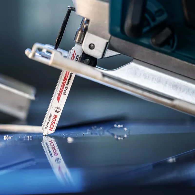 Lames de scie sauteuse T118 AHM 59 mm, idéales pour la découpe précise des tôles inox (1,5 à 3 mm) et plastiques renforcés de fibres de verre. Grâce à leur technologie Carbide, elles offrent une longue durée de vie et une coupe nette. Compatibles avec toutes les scies sauteuses à emmanchement en T.