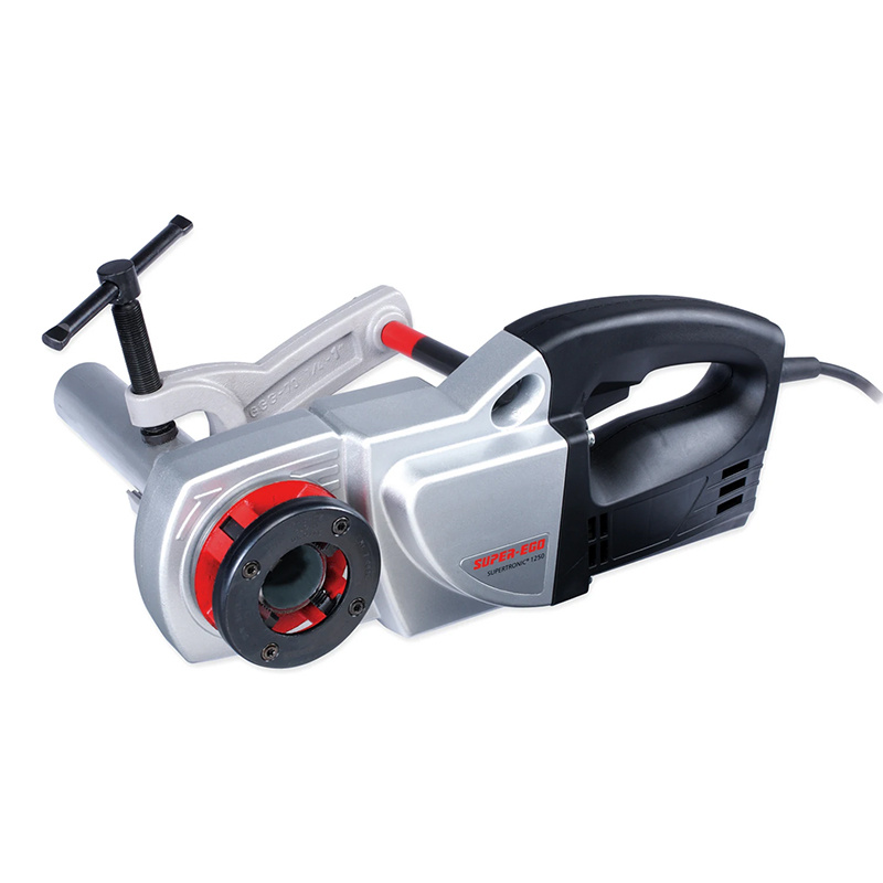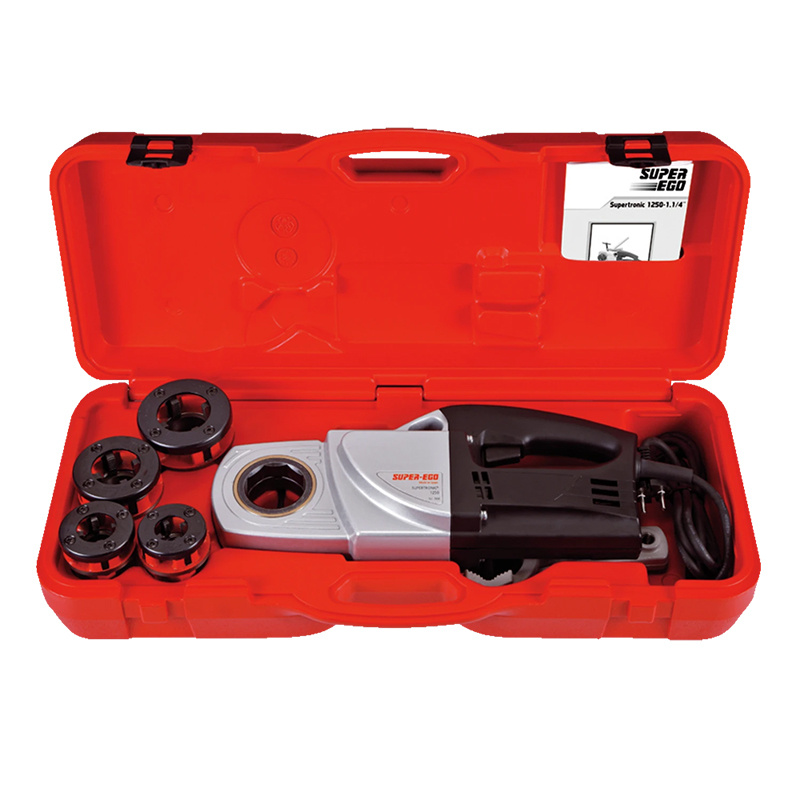Filière électrique SUPERTRONIC 1250 Ø1/2"–1"1/4 BSPT. Inverseur électronique, corps alu, carter renforcé. Zone de filetage ultra-basse. Mallette + 3 têtes incluses.
