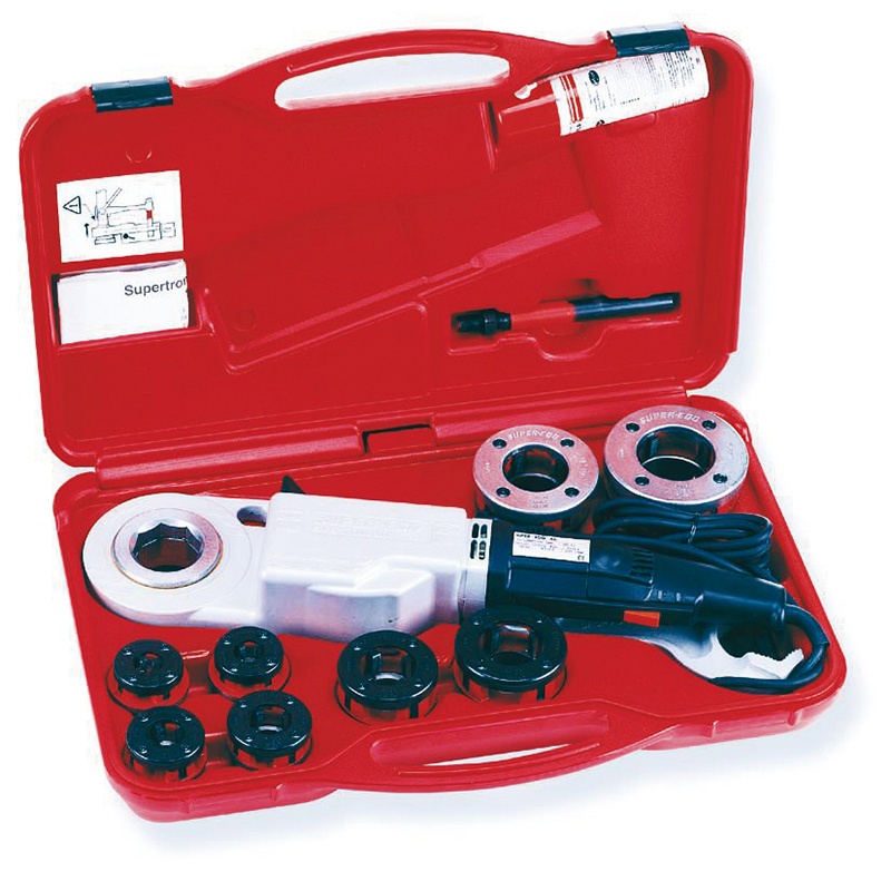 Filière électrique SUPERTRONIC® 2000 – Ø1/2" à 2". Pour filetage conique DIN 2999, moteur 1010 W robuste. 6 têtes + fixe-tube + adaptateur dans coffret résistant. Inversion mécanique et transmission sur roulements.