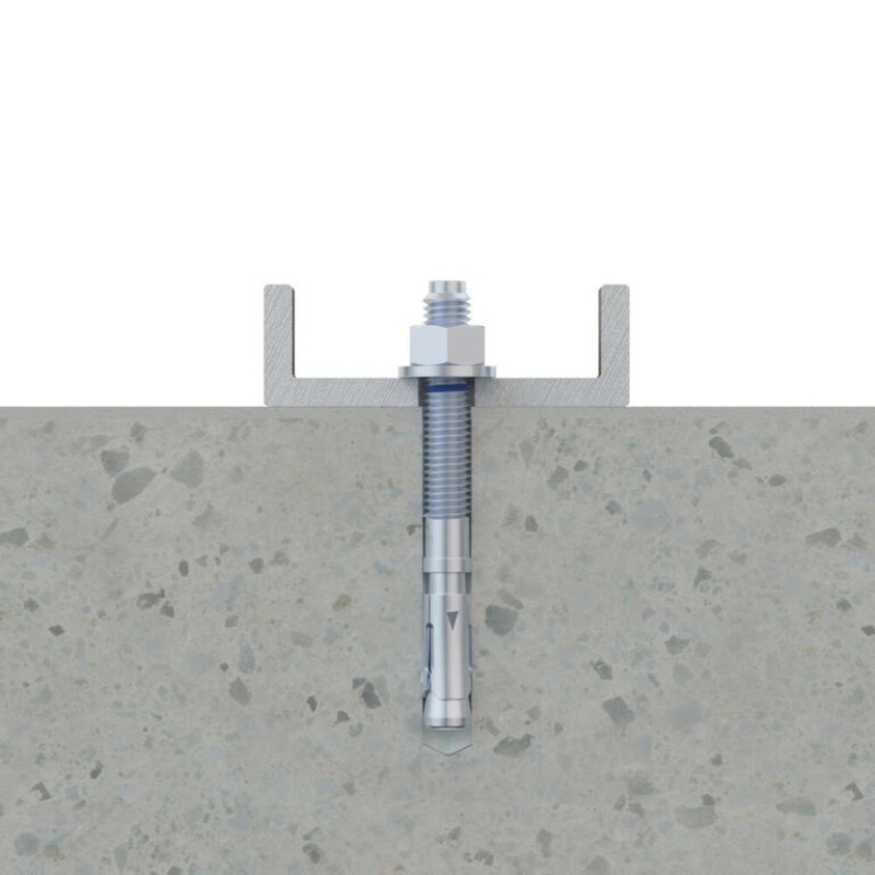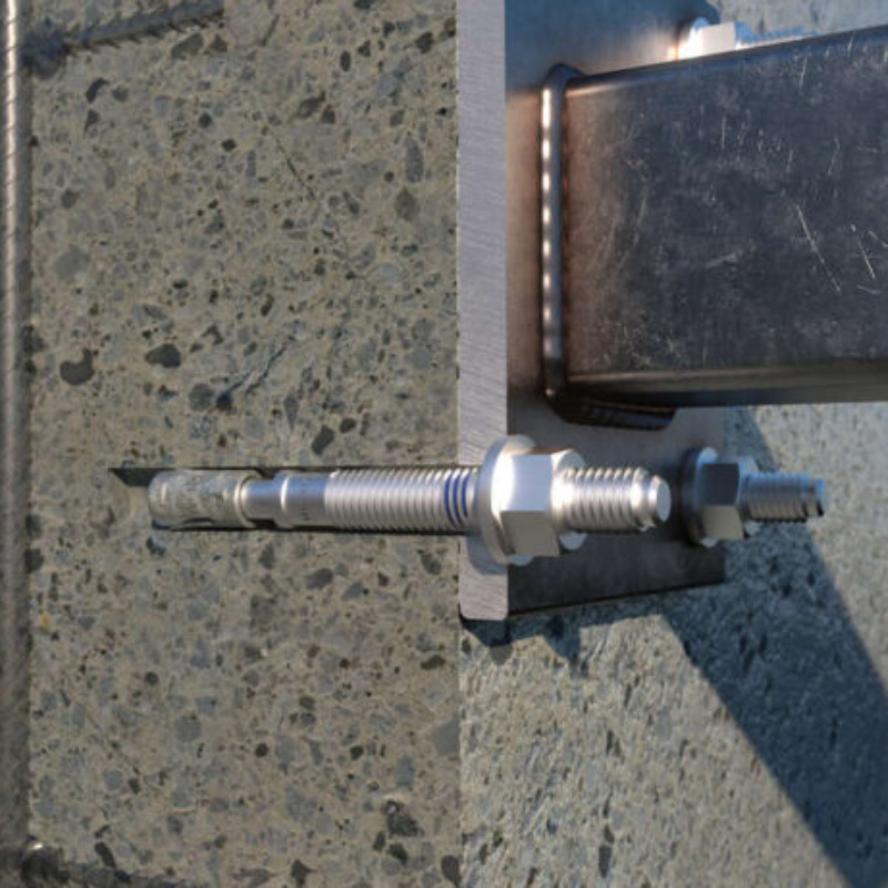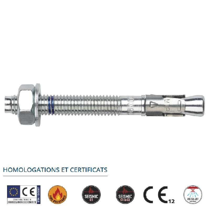 Goujon d'ancrage conçu pour des fixations structurelles dans le béton fissuré et non fissuré. Il fonctionne par expansion contrôlée du couple, avec une tige en acier zingué et un clip en acier inoxydable A4. Homologué ETE Option 1, garantissant sa performance pour des applications exigeantes.