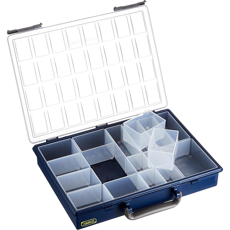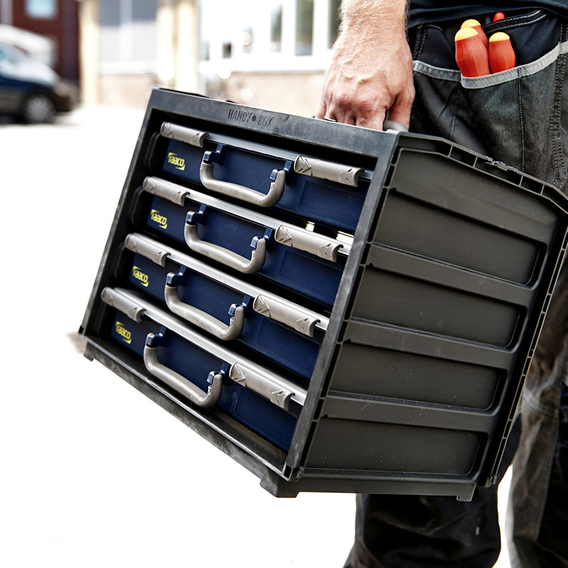 Handy Box 4 tiroirs – 4 mallettes incluses Coffret de transport robuste avec 4 Assorter 55 compartimentées. Polypropylène léger, résistant et empilable.