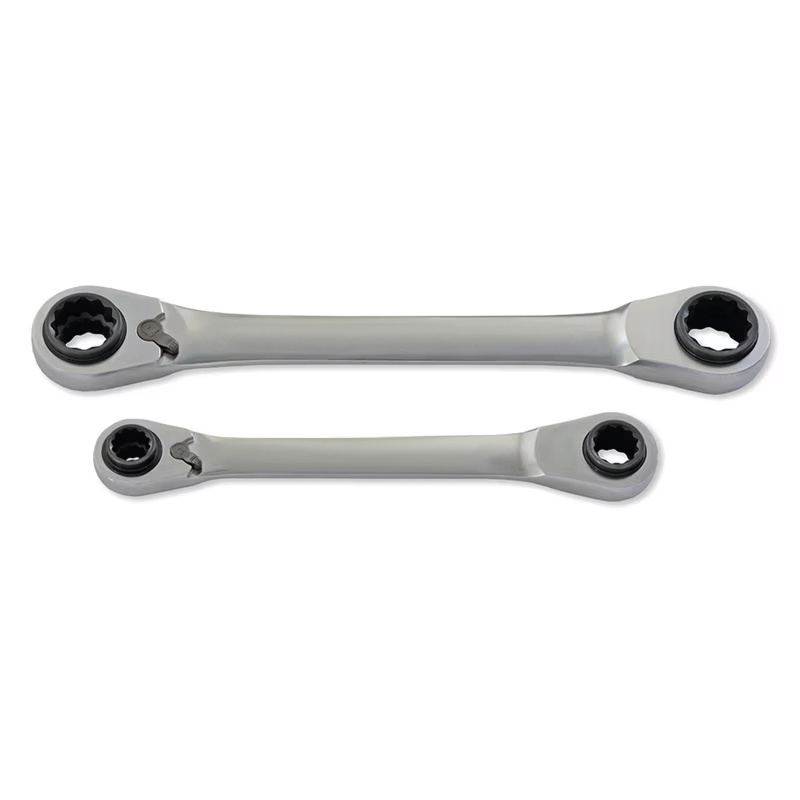 Jeu de 2 clés œil à cliquet 8 en 2, réversibles et polyvalentes, avec finition polie chromée pour une résistance optimale. Comprend les tailles : 8x10mm, 11x13mm, 16x17mm et 18x19mm, offrant une solution pratique pour un serrage rapide et efficace.