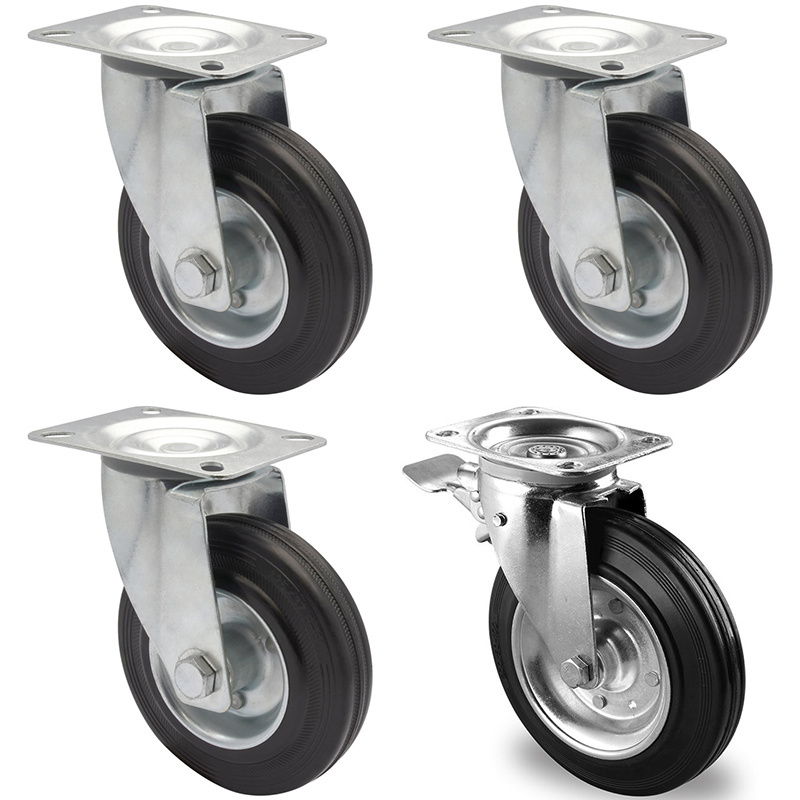 Jeu 4 roulettes PRATIC pour coffre chantier BANKBOX/OXBOX. 3 sans frein + 1 avec frein, caoutchouc semi-élastique, charge 175 kg/roue. Fixations incluses, mobilité silencieuse sur sols irréguliers.