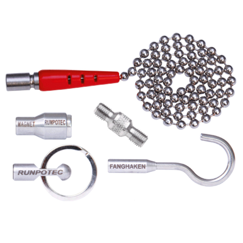 Le jeu de 5 accessoires RUNPOSTICKS RTG6 comprend une chaîne à boules, un aimant puissant, un crochet de préhension, des œillets en inox et un embout fileté, parfaits pour manipuler et guider des câbles ou objets dans des espaces confinés. Idéal pour les installations dans des zones difficiles d’accès. Compatible avec les tiges RUNPOSTICKS RTG6.