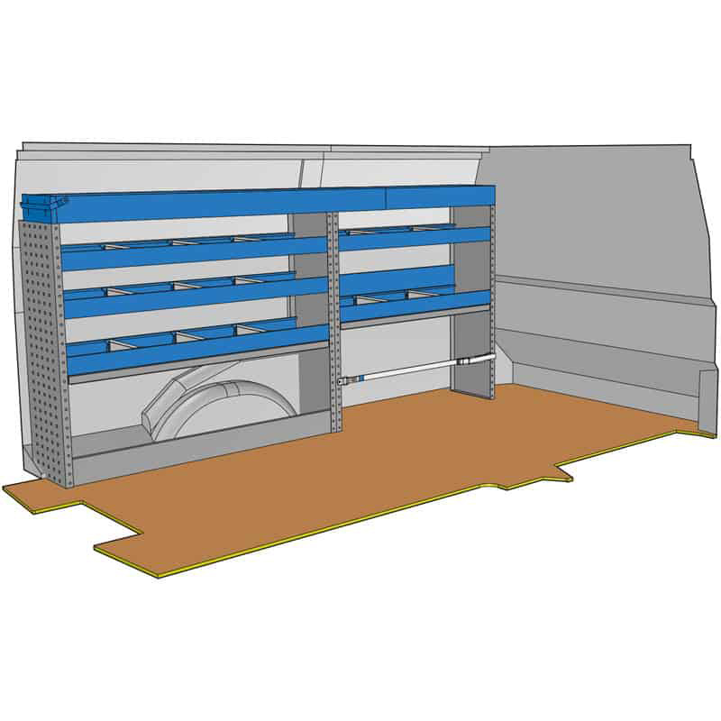 Kit KF70 – Aménagement XL pour fourgons longs. Espace optimisé avec 5 étagères, couvre-passages et profilé supérieur. Dimensions : 2282 x 1108 x 310 mm – Poids : 51,54 kg. Acier/alu – Visserie incluse – Installation rapide.