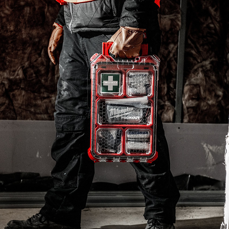 Kit de 1er secours PACKOUT™ DIN 13157 Boîtier rouge IP65, ultra-résistant et empilable PACKOUT™ Contenu complet normes DIN 13157 – 5 bacs modulables Idéal chantiers, ateliers, industrie – Format compact & visible