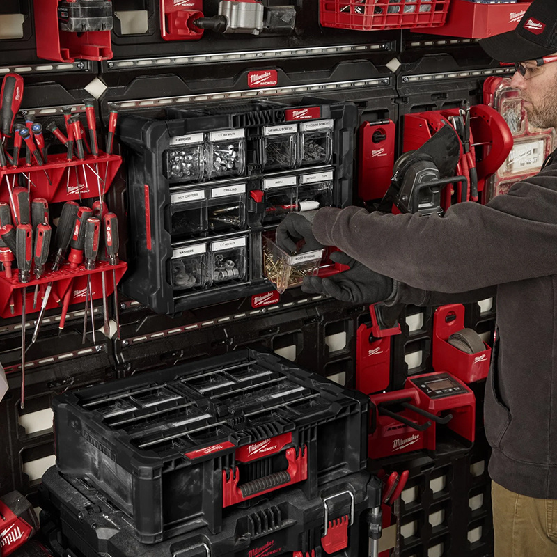 Malette Organiseur Tip Bin PACKOUT™. Rangement robuste et modulable pour vis, clous et accessoires. 10 bacs transparents inclinables, supporte jusqu’à 22,7 kg. Empilable et compatible avec tout le système PACKOUT™.