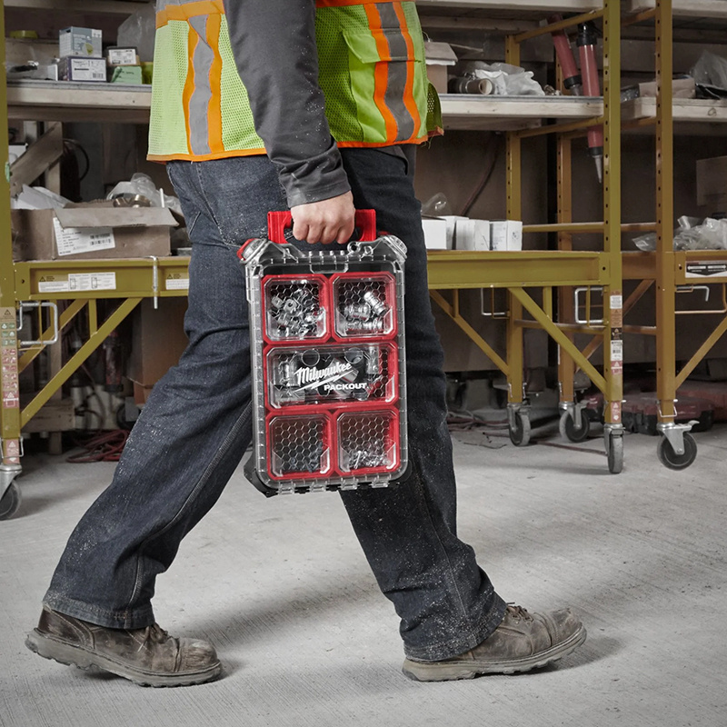 La mallette organiseur PACKOUT™ Compact (249x386x117mm) offre un rangement robuste et modulable avec 10 bacs amovibles. Sa construction résistante aux chocs et son joint IP65 protègent vos outils de l'eau et de la poussière. Compatible avec toute la gamme PACKOUT™ pour un stockage optimisé.
