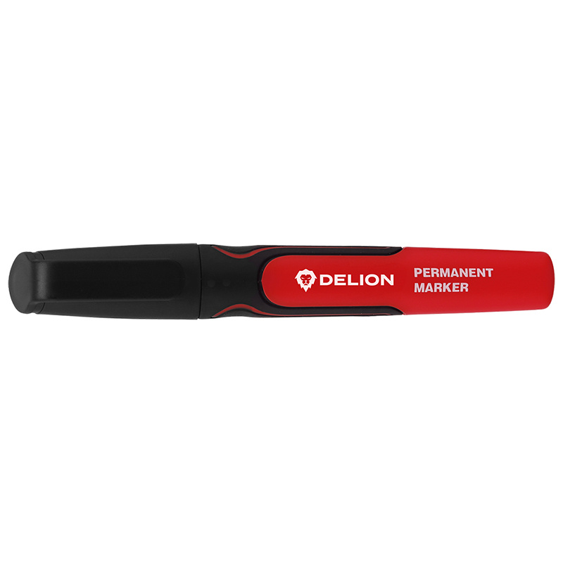 Marqueur indélébile noir DELION – Pointe 2 mm. Encre noire permanente à séchage rapide, jusqu’à 72 h sans capuchon. Écrit sur béton, bois, métal, plastique, OSB, contreplaqué. Grip souple, grande contenance – à l’unité ou boîte de 12.