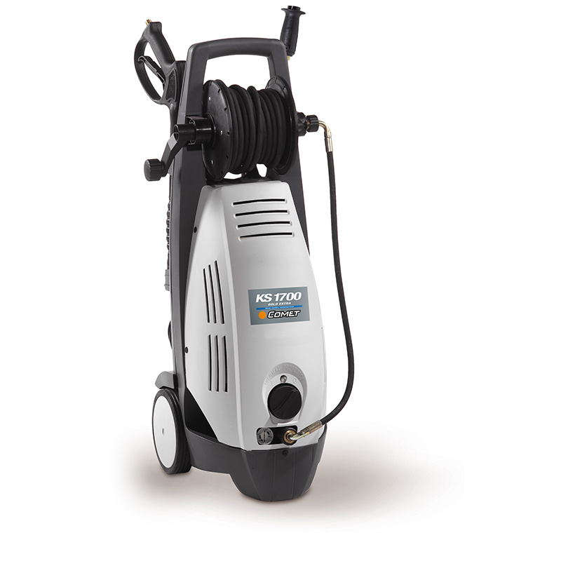 Nettoyeur Haute Pression Cleanet 1800 Pompe métallique 3 pistons verticaux avec culasse laiton et réservoir 1,8 L. EASY START, Total Stop, filtre eau et flexible haute pression 10 m. Ergonomique et facile à déplacer, idéal pour professionnels et ateliers.