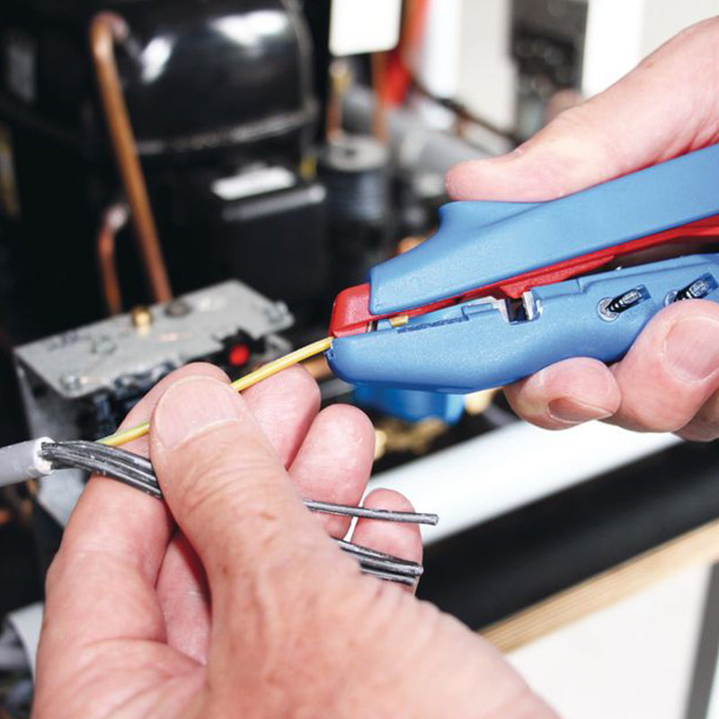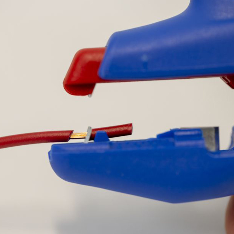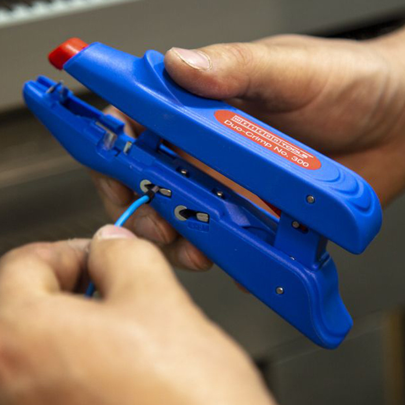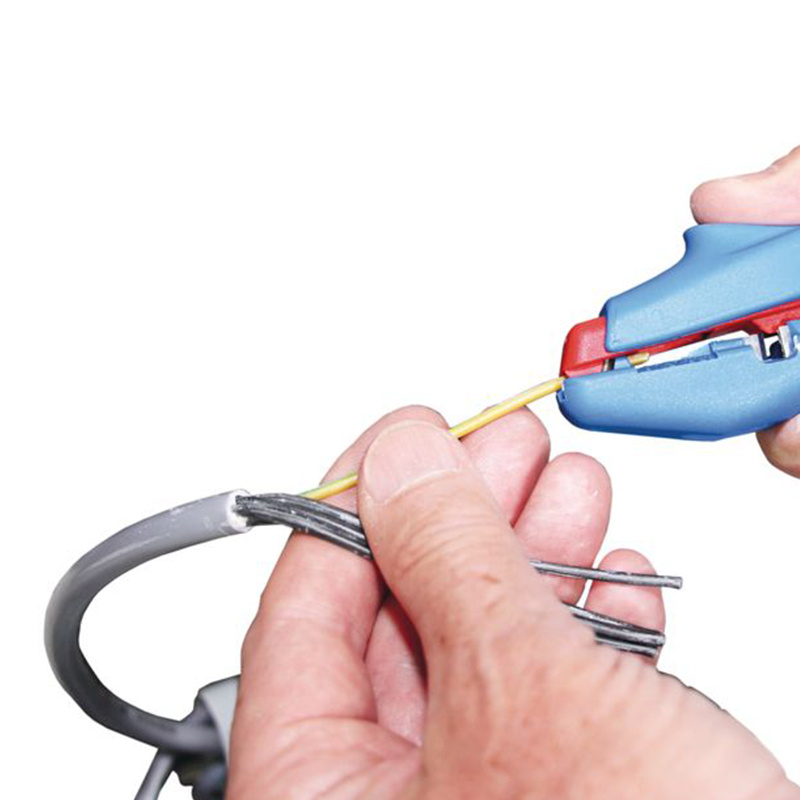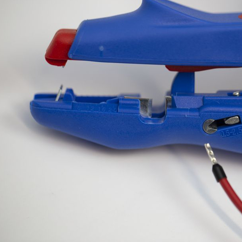 Outil à dénuder et sertir DUO CRIMP 300 2-en-1 pour dénudage et sertissage de 0,5 à 6 mm². Zones de sertissage DIN 46228-2, coupe-fil intégré. Corps renforcé fibre de verre, lame remplaçable.