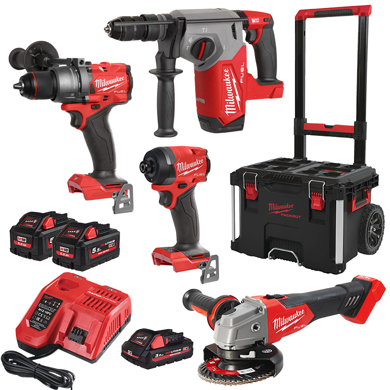 Le pack Quatro Milwaukee® M18 FPP4AE-533P offre des outils puissants et polyvalents : visseuse à percussion, visseuse à choc, perforateur-burineur et meuleuse. Avec deux batteries High Output 5.5Ah et une 3.0Ah, il garantit une autonomie prolongée, tandis que le chargeur rapide et le coffre trolley Packout facilitent le transport et l’organisation sur chantier.