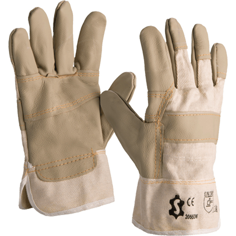 Gant de travail en cuir fleur avec renfort et pouce palmé. Doublure en coton pour un confort optimal, serrage élastique au dos. Certifié CE, idéal pour la construction, l'industrie, et la manutention.