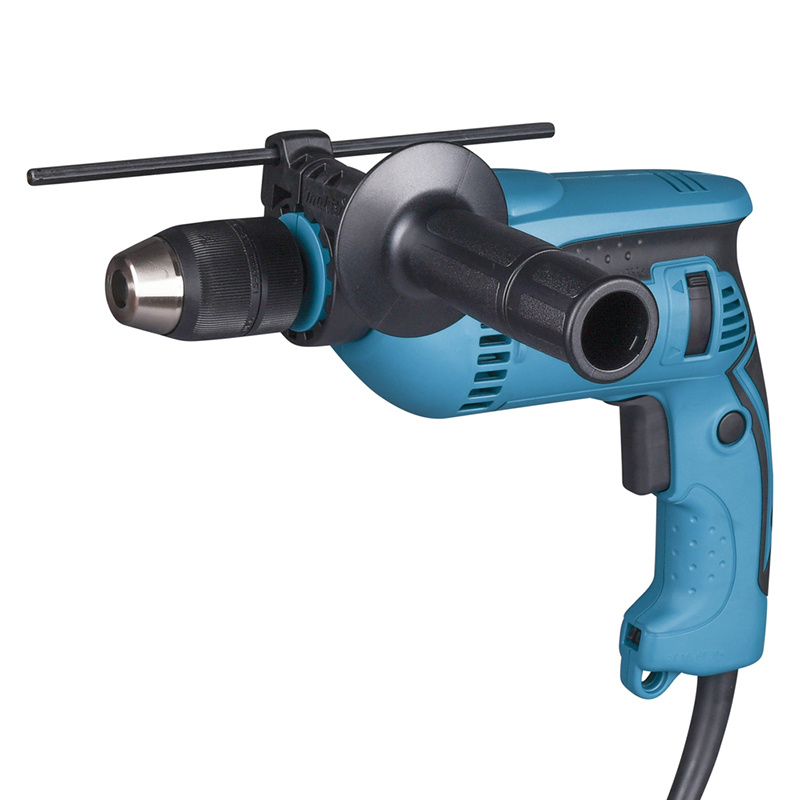 Perceuse à percussion Makita HP1641K1X – 680 W. Compacte, puissante et polyvalente pour béton, bois et métal. Mandrin sans clé, poignée soft grip, variateur + inversion. Ø perçage max : bois 30 mm / béton 16 mm / acier 13 mm.