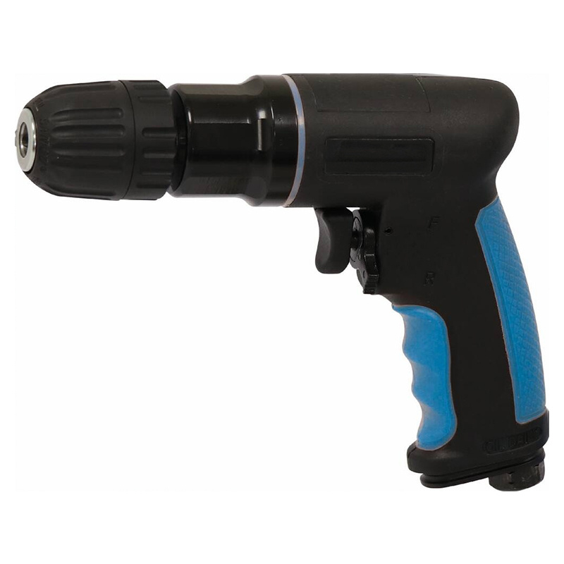 Perceuse réversible à air avec mandrin auto-serrant de 10 mm, offrant une rotation de 2200 tr/min et une consommation d'air de 120 l/min. Idéale pour des travaux de précision, elle est légère et facile à utiliser. Pression de 6,3 bar et raccord d'entrée air 1/4".