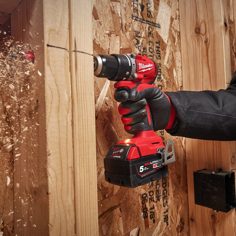 Perceuse-visseuse compacte Milwaukee M18 BLDDRC-502C 18V 5Ah. Puissante (61 Nm) et ultra-compacte (145 mm), idéale pour les espaces restreints. Mandrin métal 13 mm, moteur Brushless et technologie REDLINK™ pour plus de durabilité. Livrée avec 2 batteries 5Ah, chargeur et coffret.