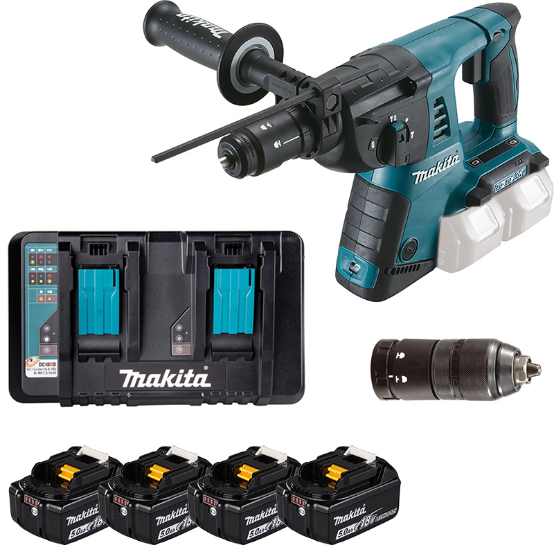 Makita DHR264PT4J – Perfo-burineur 36V (2x18V) Li-Ion – 5Ah – 4 batt. incluses. Mandrin SDS+ ou auto-serrant, 3 modes (perçage/percussion/burinage), LED intégrée. Puissance 2,5 J, Ø béton max 26 mm, antivibration, XPT étanche. Livré avec coffret MAKPAC + accessoires.