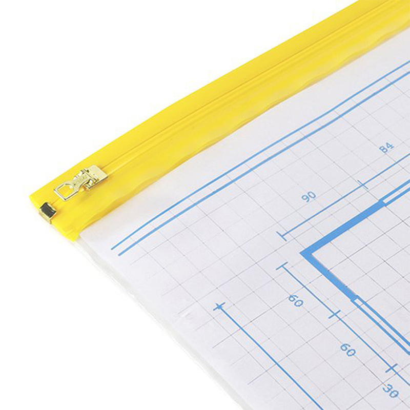 Pochette protège plans A0 900 x 1280 mm, transparent/jaune, PE 90 µm. Imperméable, résistante aux salissures, avec fermeture par curseur coulissant. Idéale pour chantiers, bureaux et transport de documents grands formats.