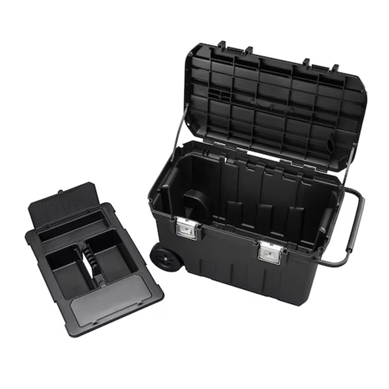 Roulotte de chantier Stanley 110L – Grande capacité et transport sécurisé. Stockage optimisé pour outils volumineux. Loquets métalliques résistants et poignée télescopique ergonomique. Roues robustes testées sur route pour une mobilité optimale.