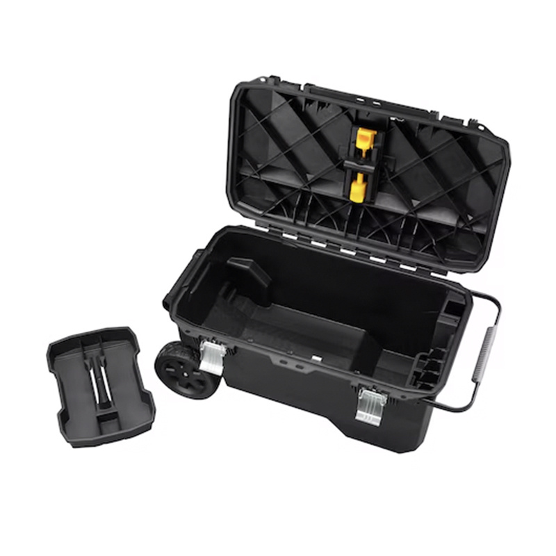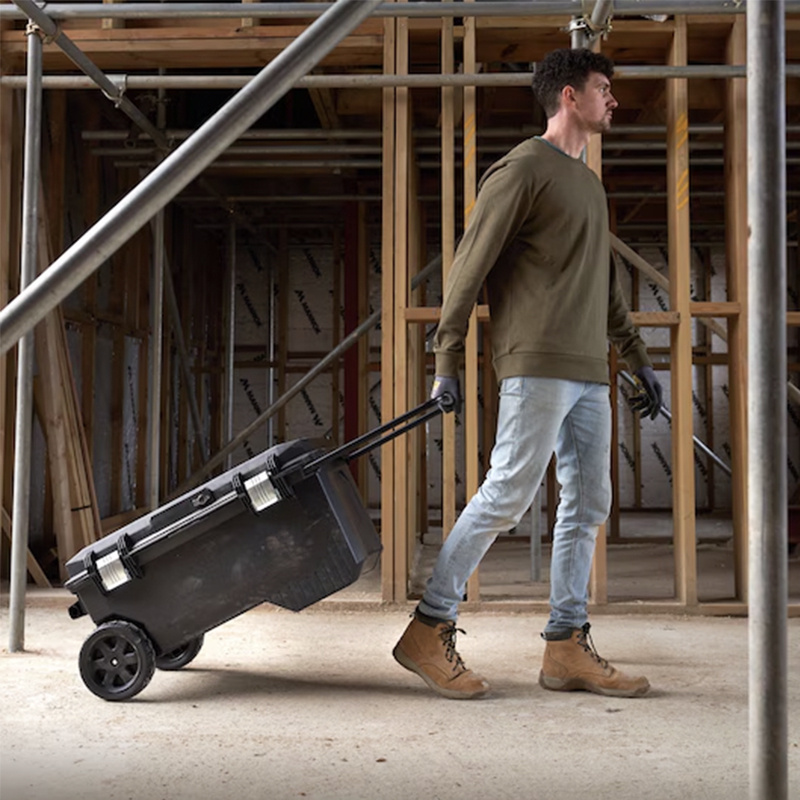 Roulotte de chantier Stanley FatMax 113L. Volumes généreux et étanchéité pour protéger vos outils. Poignée télescopique et poignée arrière pour un transport facile. Système de verrouillage sécurisé et organisateur vertical amovible.