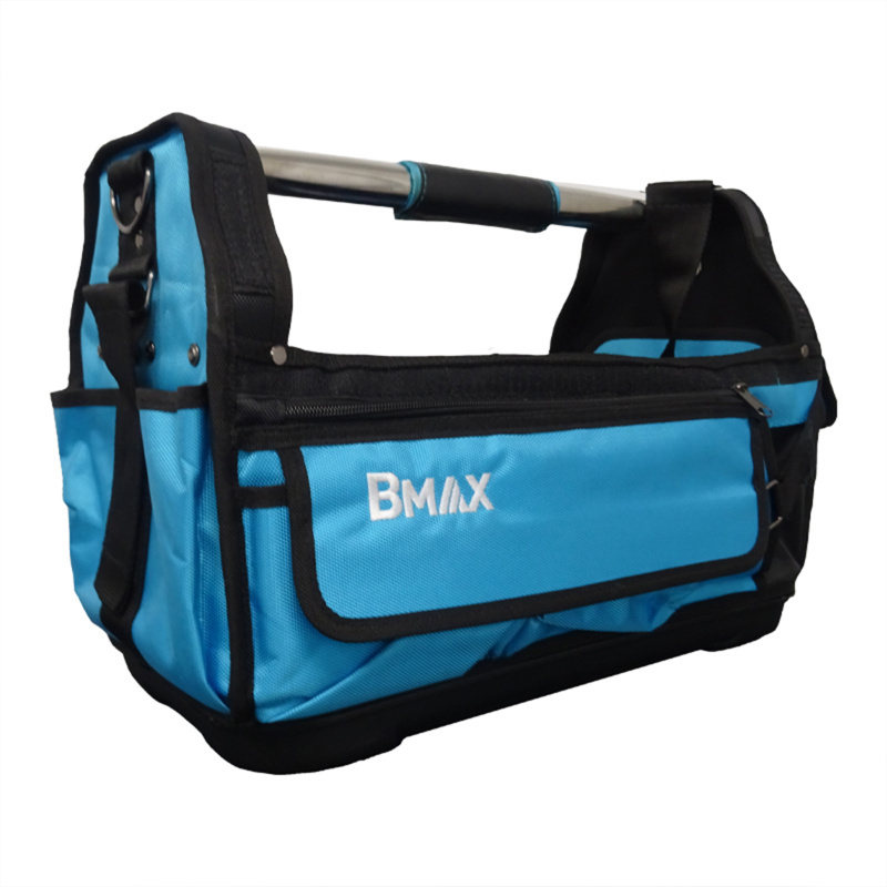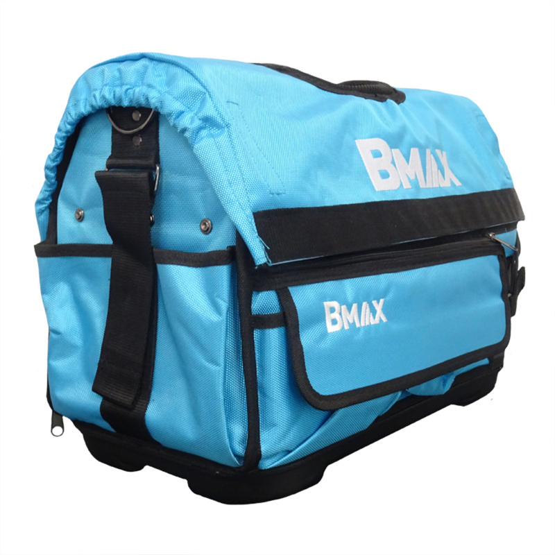 Sac à outils TUMAX – 520 x 260 x 360 mm Textile épais avec capote waterproof. Sangle d’épaule rembourrée. Maintien élastique pour scie et tournevis. Idéal pour les pros en mobilité.