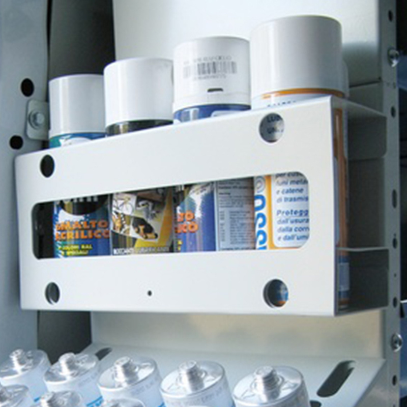 Support métal pour aérosols Rangement pour 4 sprays Ø 65 mm max. Structure métal robuste – 80 x 310 x 140 mm. Idéal atelier ou aménagement véhicule.