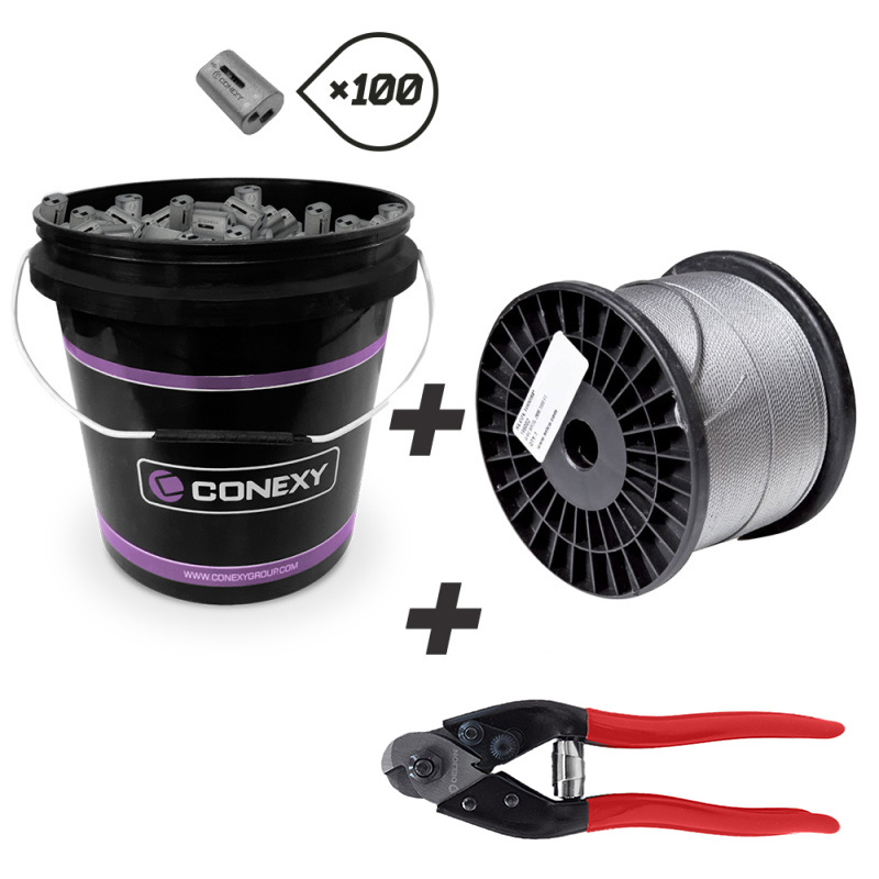 Système Fastlok 50 kg – kit complet. 1 bobine 100 m câblettes N°2, 100 verrous N°2, 1 coupe-câble DELION 190 mm et seau PVC avec couvercle. Solution pratique et robuste pour suspensions rapides.