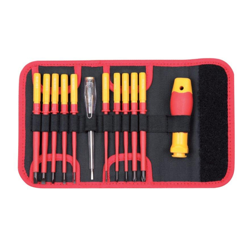 Trousse vissage électricien 1000V – 12 pcs Outils isolés certifiés VDE/GS EN60900. Tournevis + embouts plats & PH, testeur tension. Compacte, idéale pour les pros du courant fort.