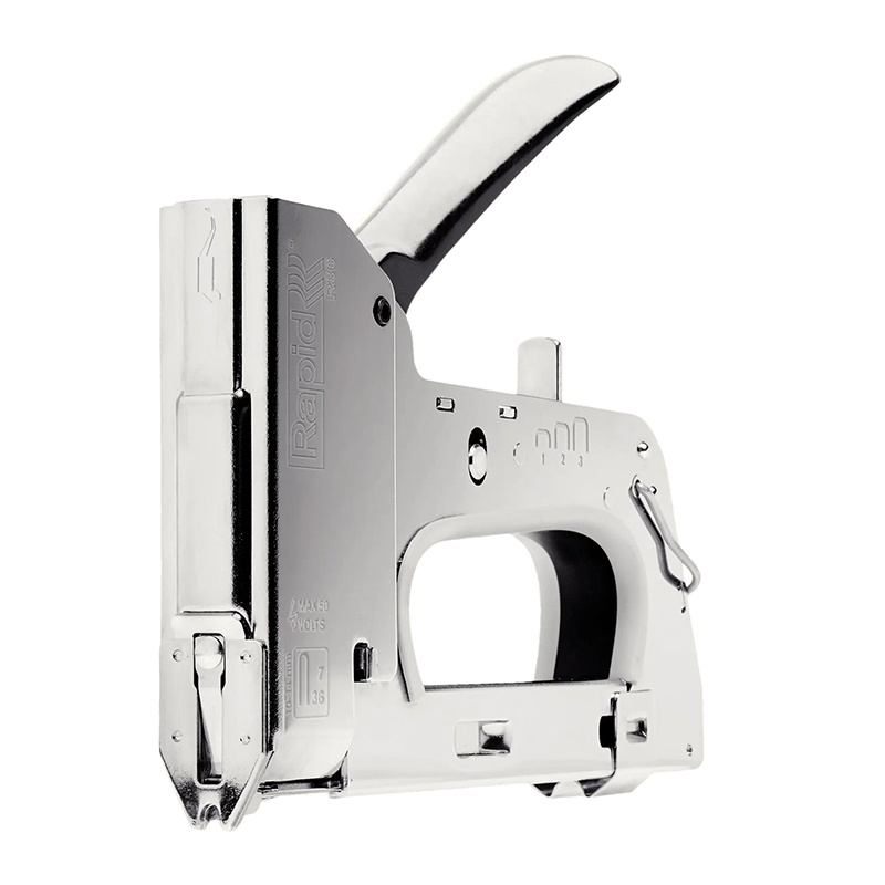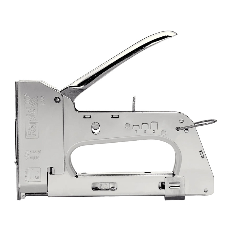 Agrafeuse manuelle RAPID R36 pour câbles Pose rapide de câbles basse tension jusqu’à 6 mm Ø. Réglage de puissance 3 positions + technologie Powercurve™ (–40 % d’effort). Compatible agrafes cavaliers 7/36 (10–14 mm).