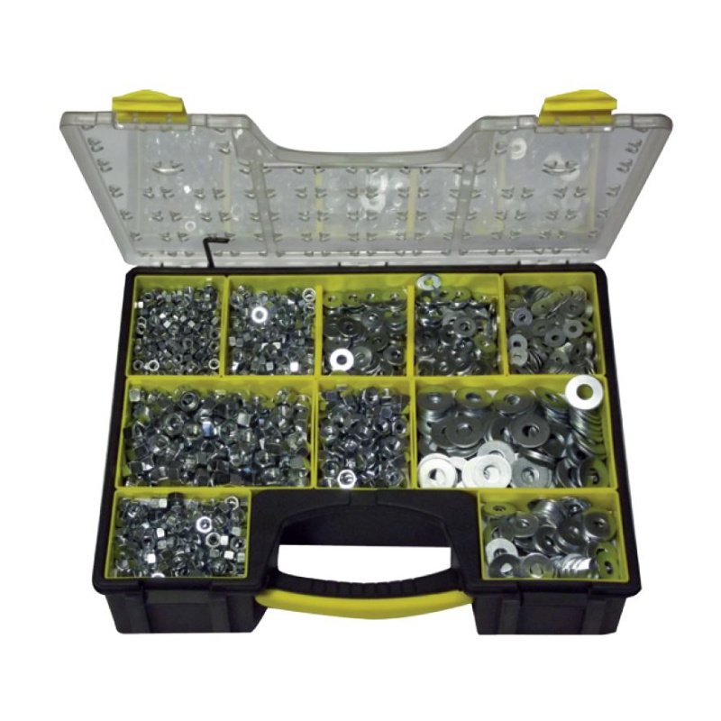 Assortiment écrous et rondelles AZ N°8 en mallette Landy 8 cases. Écrous 6 pans Ø5-Ø12 mm et rondelles plates Ø5-Ø12 mm. Quantités adaptées aux besoins chantier (voir détails).