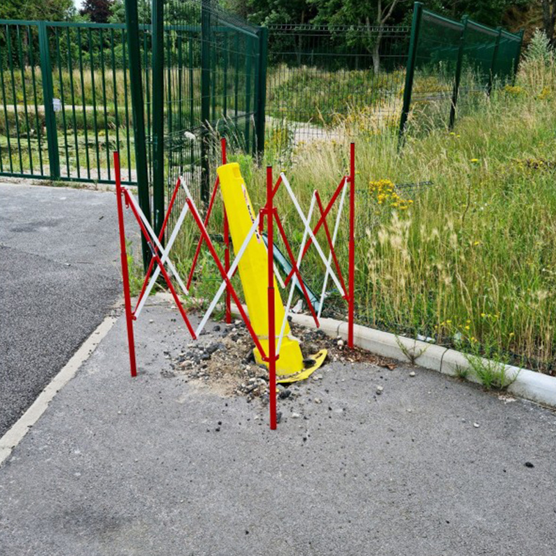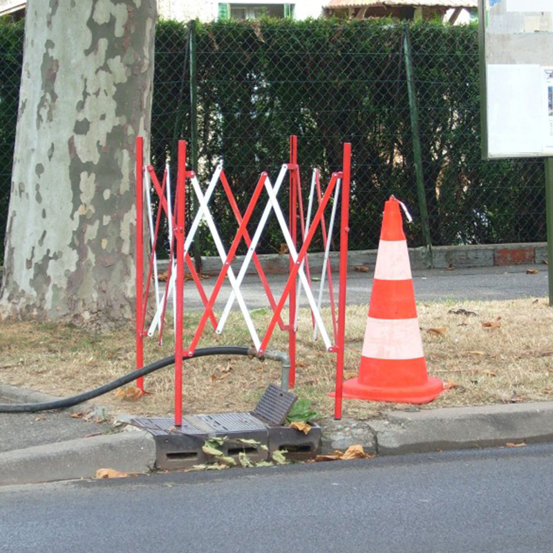 Barrière de regard extensible 1300 x 1300 x 1080 mm en acier rouge/blanc. Solide, avec fixations inox et peinture époxy anti-UV. Facile à déployer et à replier, idéale pour sécuriser regards et zones de chantier. Poids de 10,5 kg.