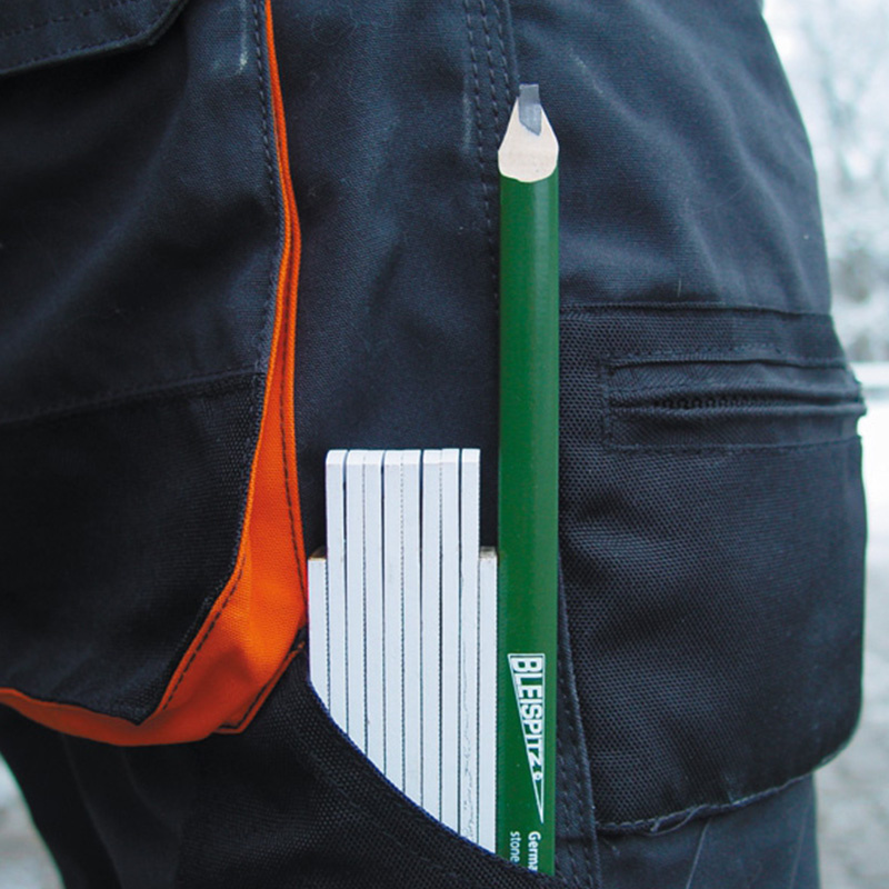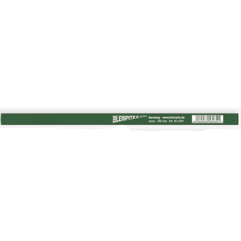 Crayons en bois de tilleul avec mine dure 10H, conçus pour marquer durablement sur surfaces rugueuses comme la pierre, la brique et le béton. Résistants aux intempéries, en couleur verte, conditionnés par boîte de 12.