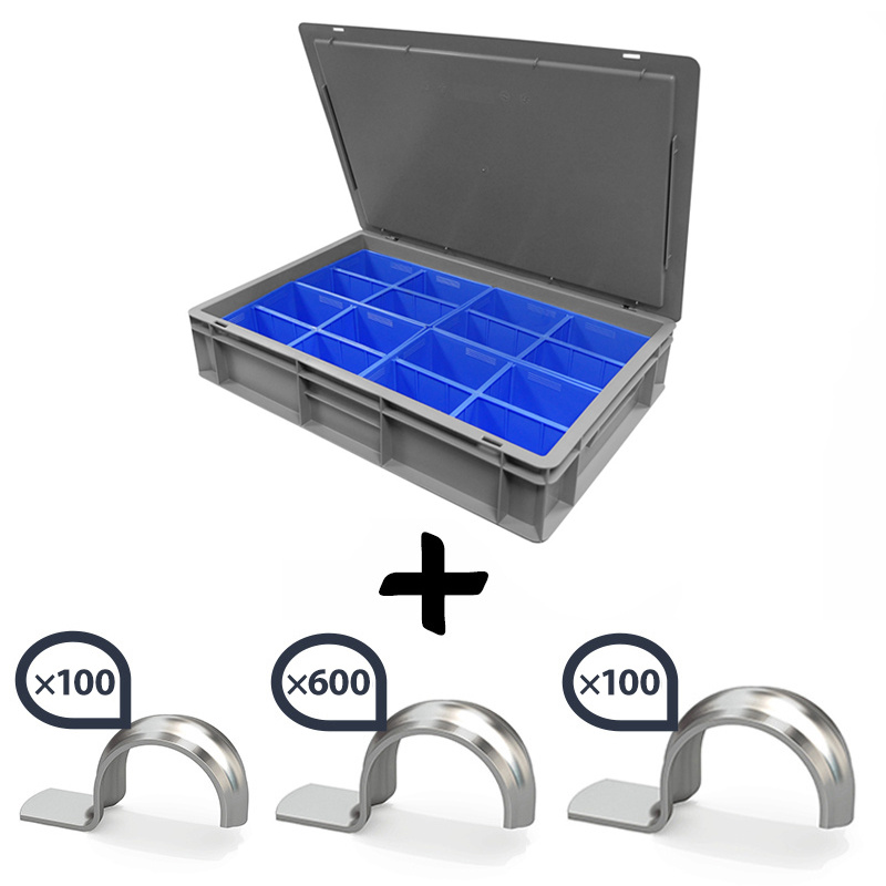 Box Crochet Métal 1000 pièces en caisse 600x400x120. Assortiment : 800x Ø20, 100x Ø16 et 100x Ø25 mm. Caisse robuste pour transport et rangement pratique.