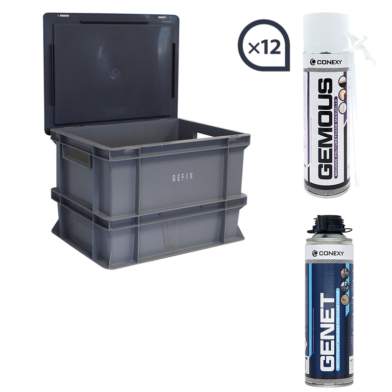 Box Mousse PU 400x300x270 mm. 12 bombes mousse expansive GEMOUS 500 ml. 1 nettoyant PU GENET 500 ml inclus. Kit pratique pour isolation et calfeutrage.