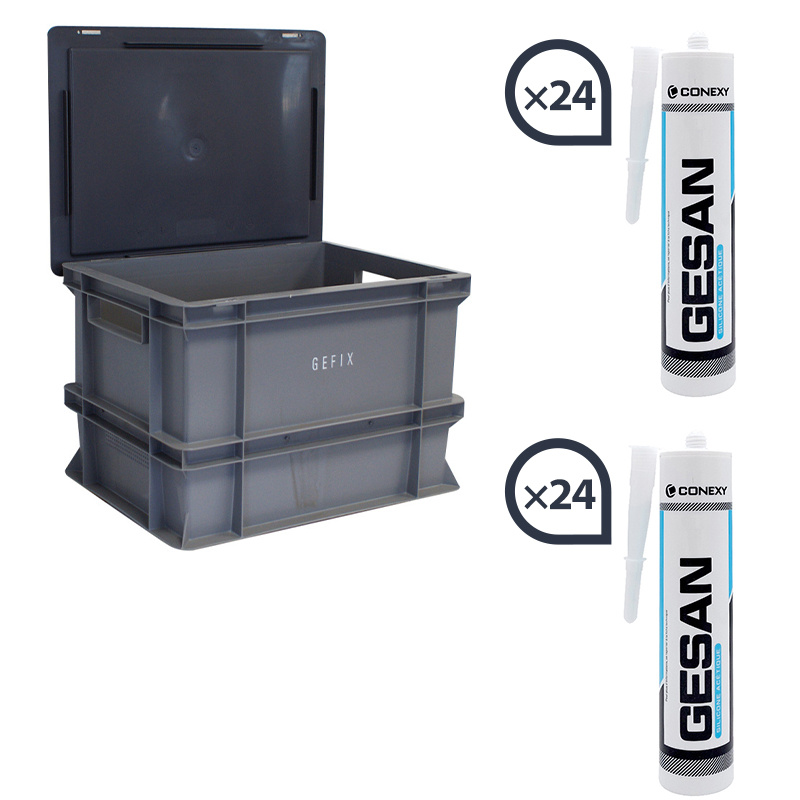 Box Silicone Sanitaire GESAN 400x300x270 mm. 24 cartouches blanches + 24 cartouches transparentes. Étanchéité parfaite pour cuisines et sanitaires. Kit pratique pour pros du second œuvre.