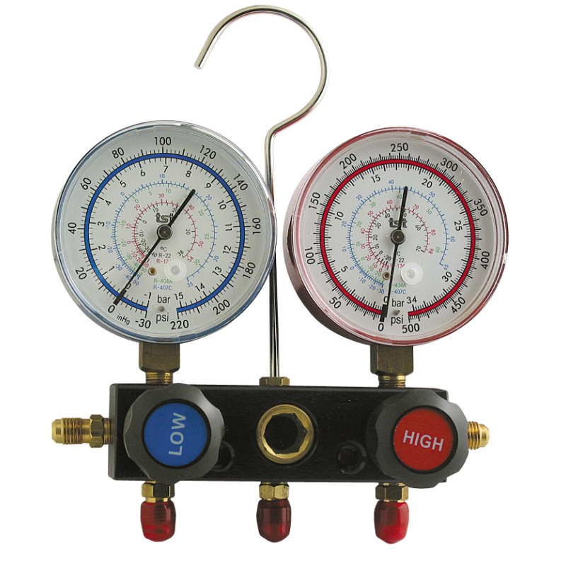 By-Pass 4 voies Ø80 mm – R410A Manomètres HP/BP Ø80 mm, classe 1. Connexions : 3x1/4” SAEM + 1x3/8” SAEM. Spécial installations R410A. Livré sans coffret ni flexibles.